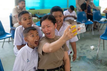 Navy Aviation Machinist’s Mate 2nd Class Txi Txi Mee Lee, from Oshkosh, Wis., poses for a selfie with children Feb. 11, 2019, during a community outreach event at the Ban Banglamung School in in Laem Chabang, Thailand. Sailors assigned to the John C. Stennis Carrier Strike Group volunteered at the Ban Banglamung School during a scheduled port visit to Laem Chabang. (Mass Communication Specialist 3rd Class Grant G. Grady/Navy)