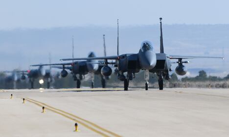 Four U.S. Air Force F-15E Strike Eagles from Royal Air Force Lakenheath, England, taxi down the flightline at Albacete Air Base, Spain, during the NATO Tactical Leadership Programme 19-1 flying course, Feb. 15, 2019. (Staff Sgt. Alex Fox Echols III/Air Force)