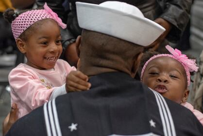 A sailor embraces with family members after graduating from Recruit Training Command on Feb. 8, 2019, at Great Lakes, Ill. More than 30,000 recruits graduate annually from the Navy's only boot camp. (Mass Communication Specialist 1st Class Spencer Fling/Navy)