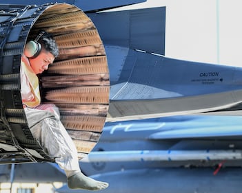 A U.S. Air Force airman assigned to RAF Lakenheath, U.K., climbs out of an engine of an F-15E Strike Eagle at Albacete Air Base, Spain, Feb. 18, 2019. (Staff Sgt. Alex Fox Echols III/Air Force)