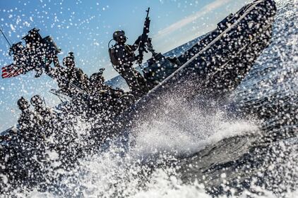 Marines and sailors with the 11th MEU ride in a rigid-hull inflatable boat during a visit, board, search and seizure exercise Feb. 24, 2019, in the Pacific. (Cpl. Matthew Teutsch//Marine Corps)