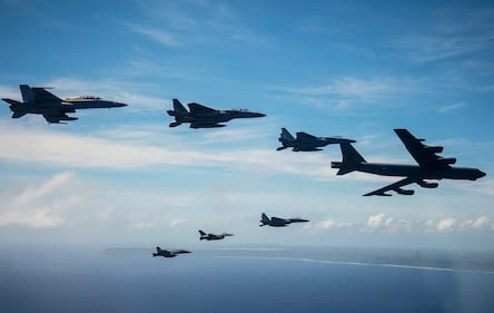 Aircraft from the United States, Australia and Japan participating in COPE North 2019 engage in a large show-of-force formation off the coast of Guam, on March 6, 2019. (Capt. Adam Engelhart/Air Force)