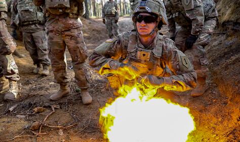 Soldiers from 1st Engineer Battalion, 1st Armored Brigade Combat Team, 1st Infantry Division, take cover March 6, 2019, as a soldier detonates an explosion during live fire explosives training at Joanna range in Zagan, Poland. (Sgt. Thomas Mort/Army)