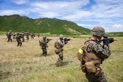 Marines advance toward targets on March 6, 2019, during a squad supported attack at the Kaneohe Bay Range Training Facility, Marine Corps Base Hawaii. (Sgt. Jesus Sepulveda Torres/Marine Corps)