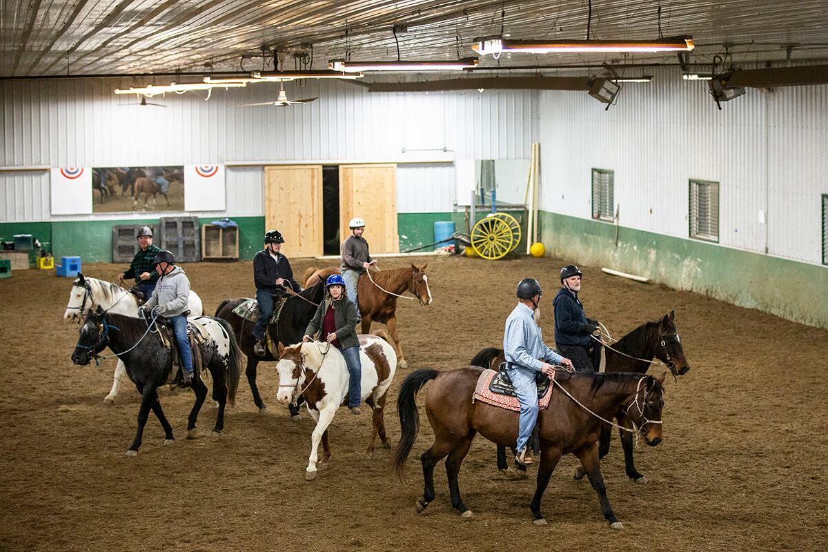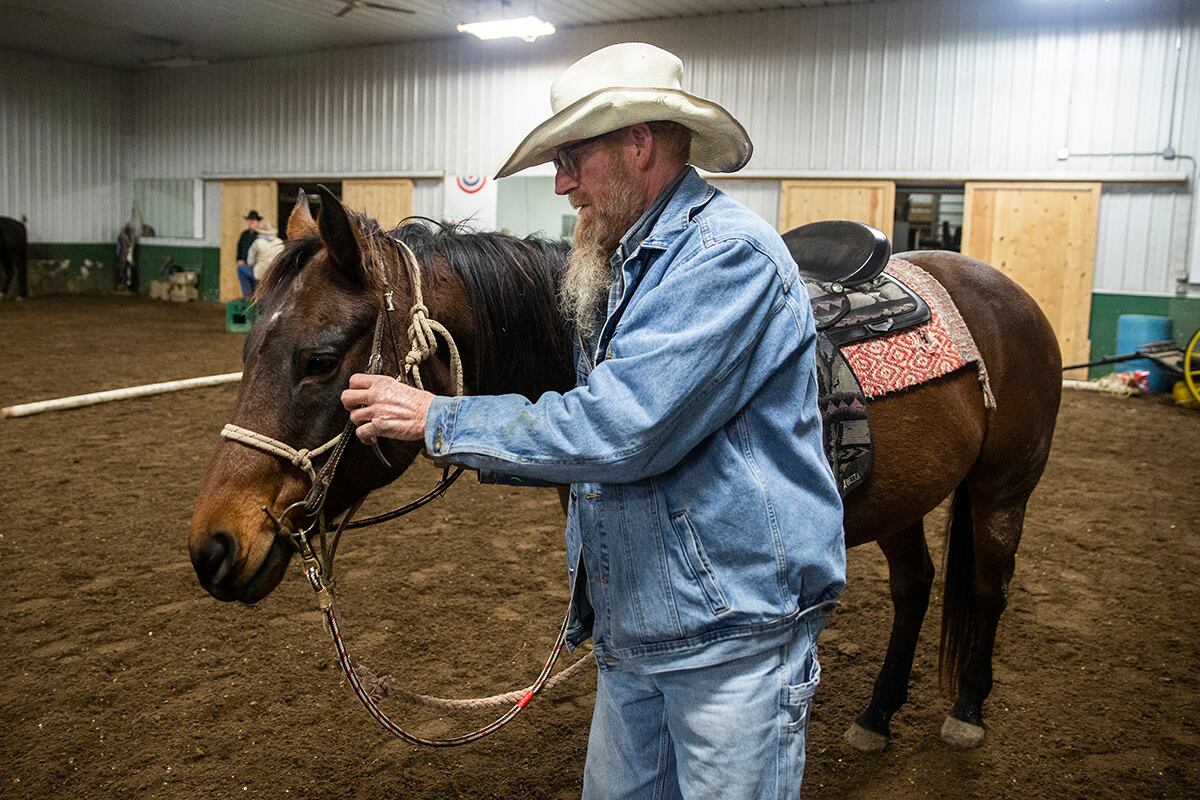 Miller and three other military veterans mount horses in an indoor horse arena at Wildwood Hills Ranch of Iowa near St. Charles, under the direction of Lynn Winkelmann.