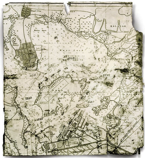 In the first week of December he burned the notes, clippings, and photographs he had used to compile his reports. On December 6, Yoshikawa settled outstanding debts and treated Mikami to dinner at Shinchōrō. But some sensitive materials remained in the consulate’s locked code room. After the attack he had to await the arrival of the consulate’s cipher clerk, who had the only keys. American authorities turned up before he could burn all the evidence and caught him with a detailed, if only half-finished, hand-drawn map of Pearl Harbor. Yoshikawa’s luck had run out.